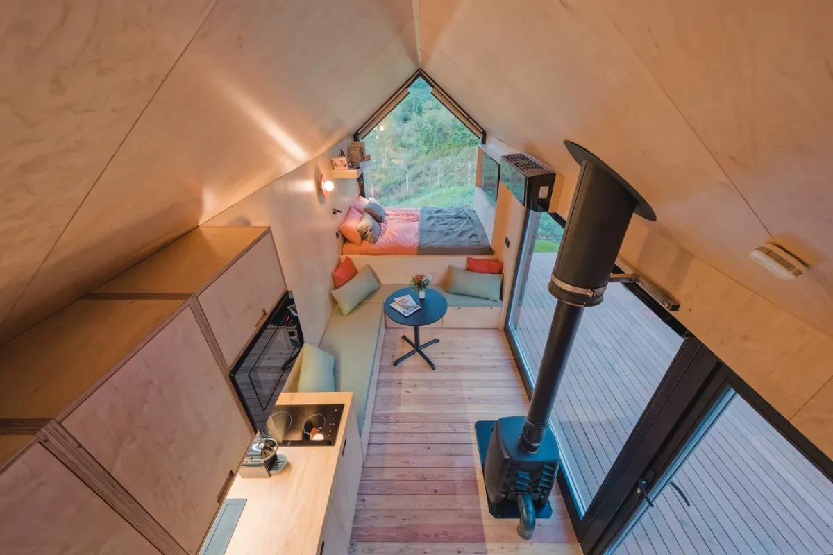 Next to the kitchen is the living room. It feels spacious for a tiny house, with an L-shaped sofa that has built-in storage, a coffee table, and a wood-burning stove. The sleeping area is adjacent, offering a double bed, a wall-mounted TV, and a shelf.