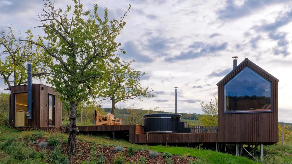This 215-square-foot tiny house in rural Hungary offers big comforts. It includes a sauna and a hot tub, making it a luxurious getaway.