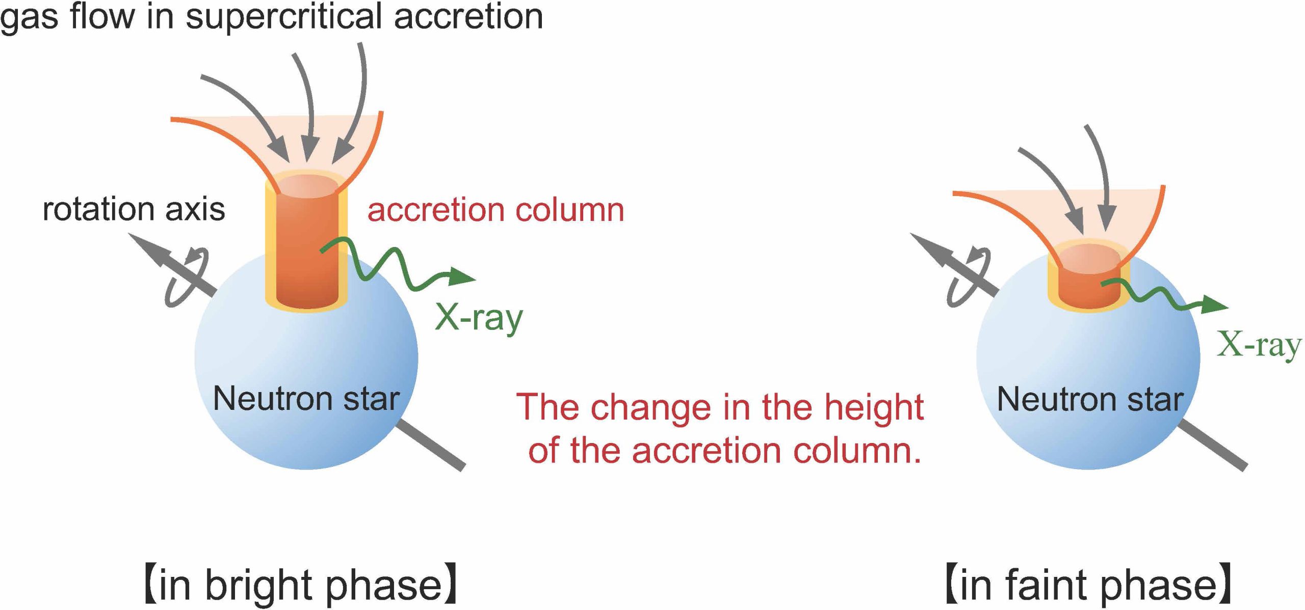 This result suggests a relationship between X-ray luminosity and rotation velocity, and that the accretion system changed during the faint phase. The research team then focused on the pulsation and performed detailed analyses. It was suggested that the height of the accretion column was changed with the 10-year flux modulation. Those results are expected to be clues to reveal the mechanism of supercritical accretion.