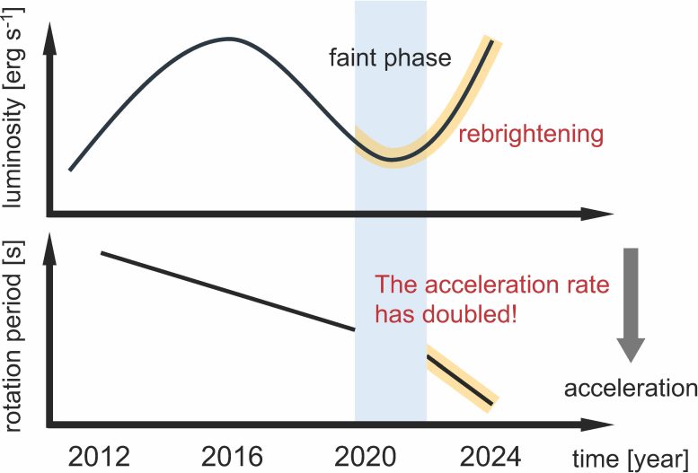 The research team investigated the long-term evolution of the X-ray luminosity and rotation period of P13 from 2011 to 2024, using the archival data of XMM-Newton, Chandra, NuSTAR, and NICER. It was found that P13 was in a faint phase in 2021 and started to be bright again in 2022. By 2024, it reached a high luminosity, more than two orders of magnitude higher than in 2021. Moreover, in the rebrightening phase in 2022, the acceleration rate of the rotation velocity was increased by a factor of 2, and it was maintained until 2024.