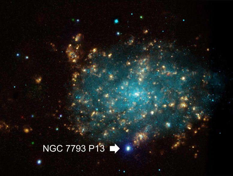 The image that combines data from X-ray, optical, and Hα line observations. NGC 7793 P13 is located away from the galactic center of NGC 7793. Credit: X-ray (NASA/CXC/Univ. of Strasbourg/M. Pakull et al.); Optical (ESO/VLT/Univ. of Strasbourg/M. Pakull et al.); Hα (NOAO/AURA/NSF/CTIO 1.5 m)