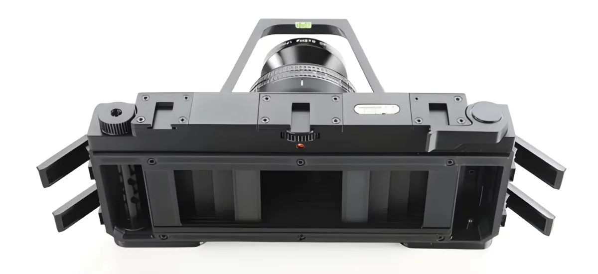The camera has several cold shoes for accessories. These include optical viewfinders, phone mounts, laser rangefinders, and light meters. A magnetic cable release docks to the camera grip for comfort and long exposures. The back is fully removable for modular accessories, like a ground glass attachment. Each lens cone has a protective cage to prevent damage.