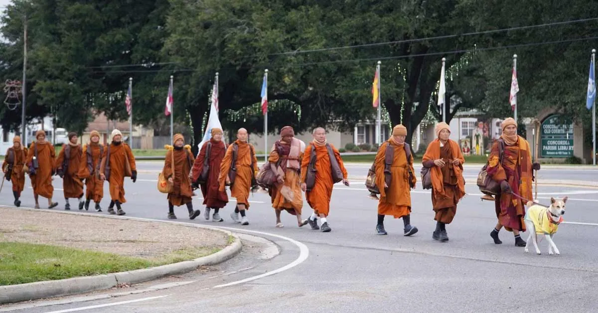 The monks started in Fort Worth, Texas, over 100 days ago with Aloka walking alongside them. But the dog had to step back from the trail earlier this year after a leg surgery. Veterinarians at a clinic provided the care free of charge. Since then, Aloka has been healing, joining the monks in short walking stints as he recovered.
