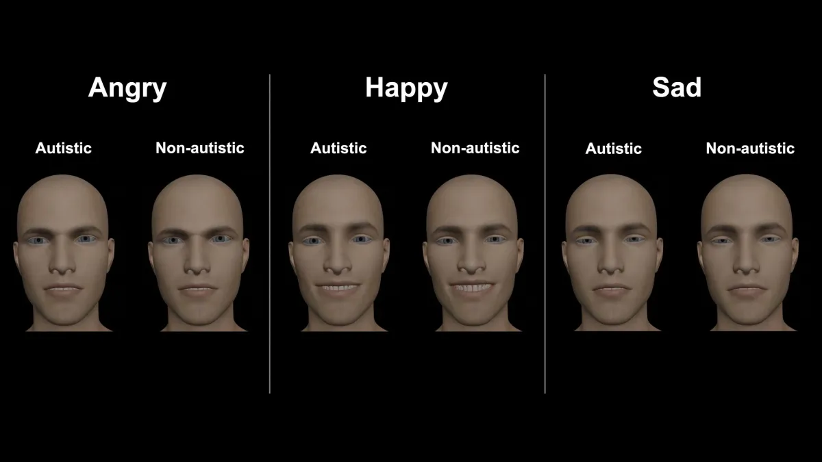 When showing anger, autistic participants relied more on mouth movements and less on eyebrow raises. Their happiness looked subtler — a smile that didn't reach the eyes in the way non-autistic smiles typically do. For sadness, they lifted their upper lip more prominently than non-autistic participants.