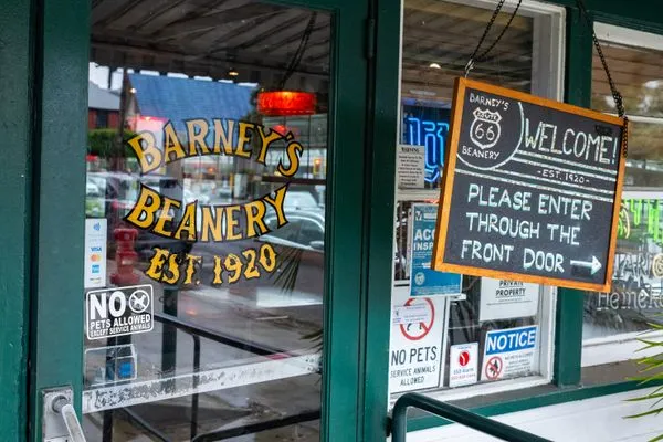 Since 1927, when it opened as a Route 66 pit stop, Barney's has accumulated the kind of lived-in character you can't manufacture. The walls are a maximalist fever dream—license plates, vintage neon, photographs layered over decades. There's a jukebox that actually works. Pool tables. Foosball. The kind of place where you can still get a burger and chili that tastes like it did in 1952.