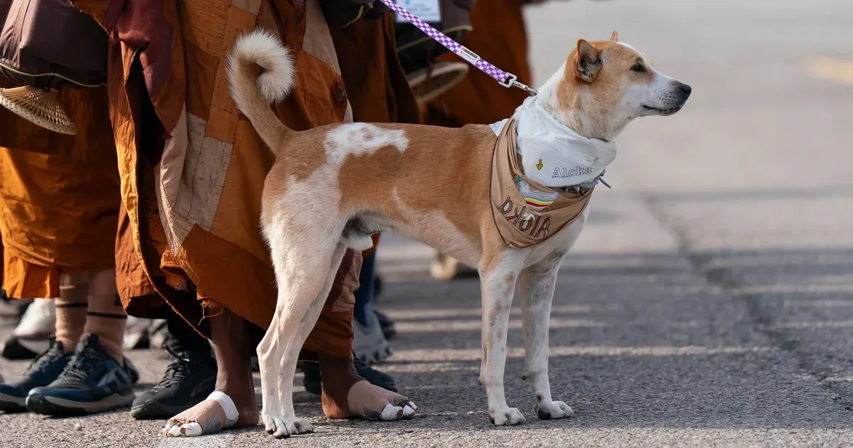 Aloka — a name meaning "divine light" in Sanskrit — has become an unlikely ambassador for a 120-day "Walk for Peace" that began in Fort Worth, Texas last October. Hundreds of thousands of people have followed his journey online. The Indian pariah dog was originally a stray who met the group's leader, Venerable Bhikkhu Pannakara, during a similar trek across India in 2022. He chose to stay with the monks, walking hundreds of miles from Kolkata to Nepal's border despite recovering from illness at the time.