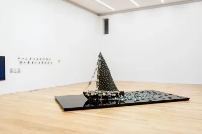 One of Kerry James Marshall's works is the installation Wake (2003–25). It shows a black-painted sailboat decorated with medallions. These medallions represent descendants of the first Africans brought to Jamestown in 1619, including a self-portrait of Marshall.