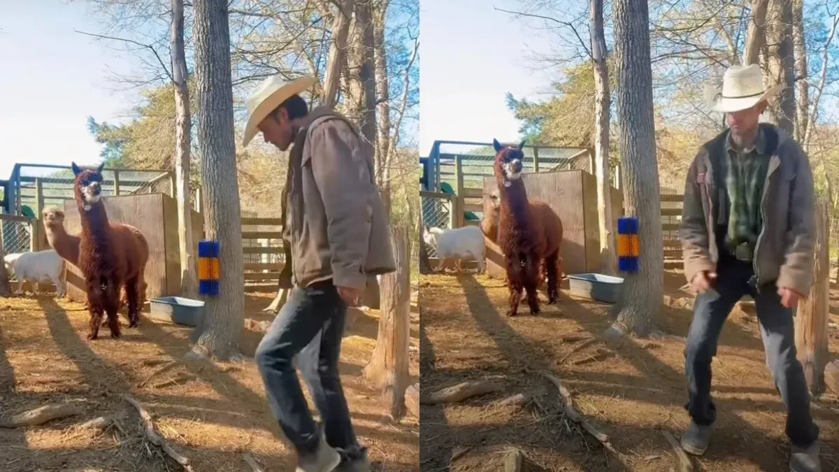 You know that moment when you're just trying to live your best life, maybe bust a move, and then reality (or in this case, an alpaca) comes crashing in? Yeah, this farmer knows. He was just minding his own business, attempting a spirited jig for his alpaca buddy, when things took an unexpected turn.