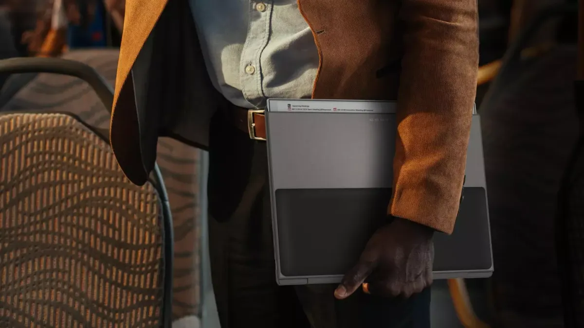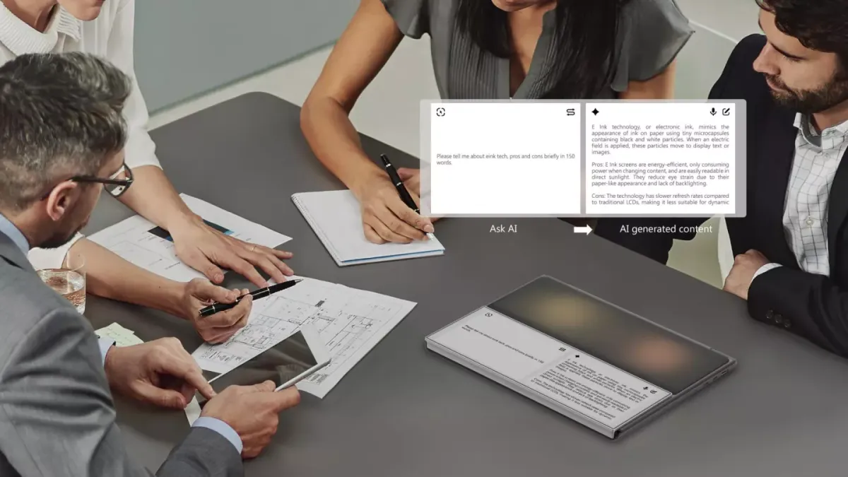 It's a simple idea with real potential. The E Ink panel supports both touch and stylus input, so you can sketch notes, annotate documents, or jot reminders without switching windows or reaching for another device. When you close the laptop lid, a thin strip of the display stays visible for notifications and quick updates. Flip the lid further, and the panel rotates to become an AI assistant interface—answering team questions or helping with tasks via voice input while ambient lighting cues signal status changes.