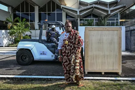 As the drum's crate was moved from the plane, a cultural group performed the traditional tchaman dance. Another ceremony will mark its permanent display at the Musée des Civilisations de Côte d’Ivoire. This is expected in April.
