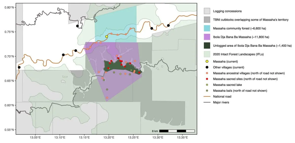 Community biocultural mapping of Ibola Dja Bana Ba Massaha: community-collected data on biocultural sites and territorial limits (north of the national road are not shown), presented along with available data on logging concessions, roads, rivers, and current villages. Also presented, for the purpose of this study, are 2020 Intact Forest Landscapes (IFLs)