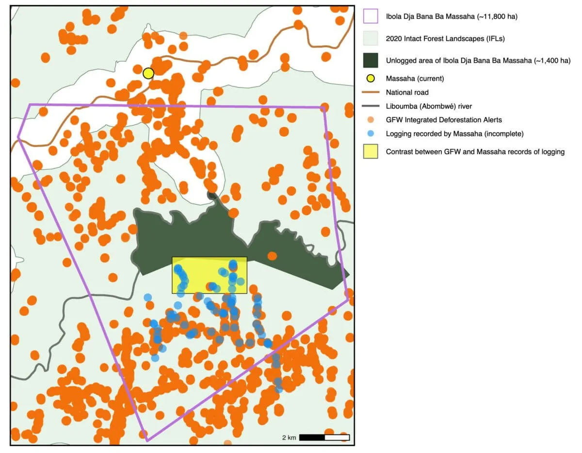Massaha villagers found this out during their own patrols. They documented logging in areas where satellite alerts showed no activity. Relying only on global data would have suggested a much larger area of untouched forest than what truly existed.