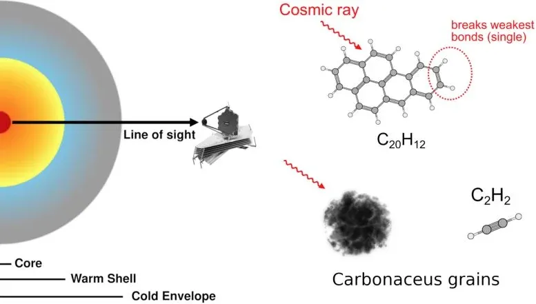 What's driving all this chemical activity isn't heat or turbulent gas alone. The researchers found that cosmic rays — high-energy particles abundant in galactic cores — are colliding with carbon-rich dust grains and fragmenting them into smaller organic molecules. These impacts release the smaller compounds into the surrounding gas, creating a continuous chemical production line. The evidence is compelling: a strong correlation exists between hydrocarbon abundance and cosmic-ray ionization levels across multiple galaxies.