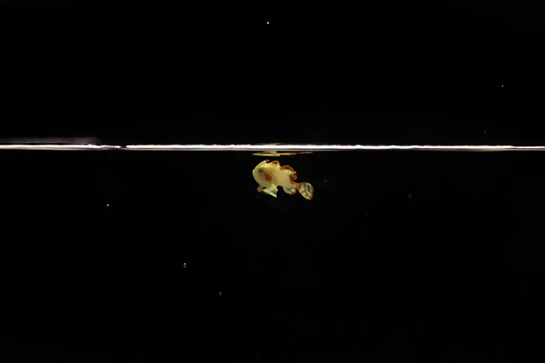 Today, Domino is less than half an inch across, about the size of a pea. The tiny fish eats brine shrimp, which are raised at the aquarium. Domino is also changing to a vibrant yellow and orange color.