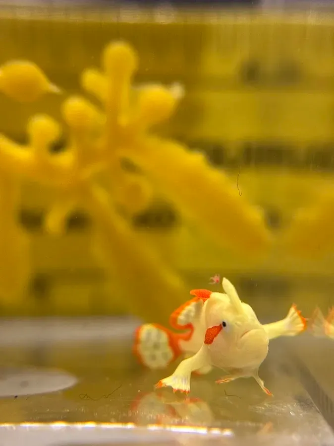 Warty frogfish "walk" across the seafloor using special fins. They also use a modified fin on their head to lure prey. Domino is slowly learning these skills. Senior aquarist Kayla Melton Rogala called it "adorable" for such a tiny animal.