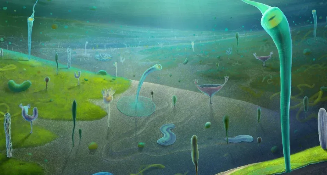 An illustration shows what the fossils' environment might have looked like between 539 million and 554 million years ago.
