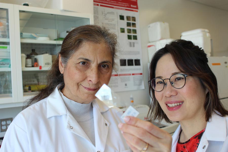 McGill professors Maryam Tabrizian (left) and Nicole Li-Jessen examine tissue samples used to confirm the safety of the gel developed in the study. Credit: McGill University