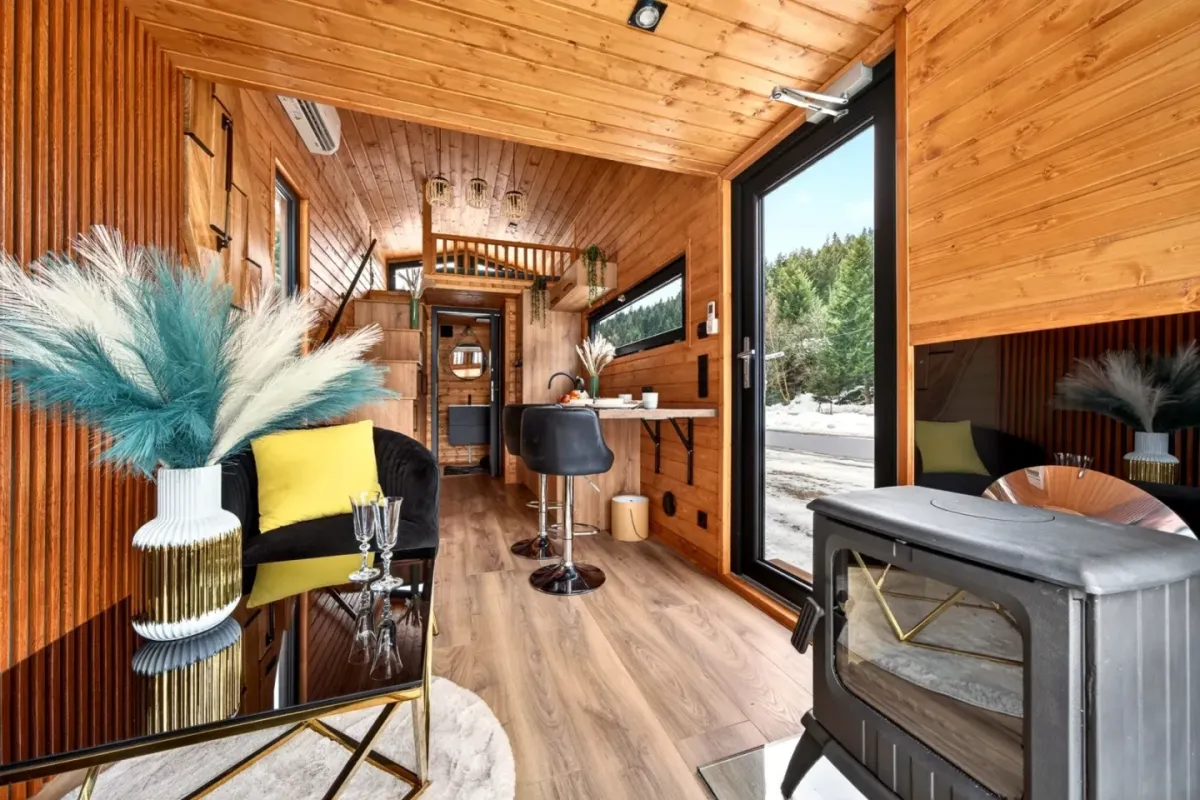 The interior measures 18 square meters (194 square feet). It uses Scandinavian spruce, which gives it a log-cabin feel. Large windows and sliding glass doors in the living room make the space feel bright and open. This area has room for a sofa and other seating. The model shown also includes a wood-burning stove and a mini-split air-conditioning unit. These work alongside the underfloor heating.