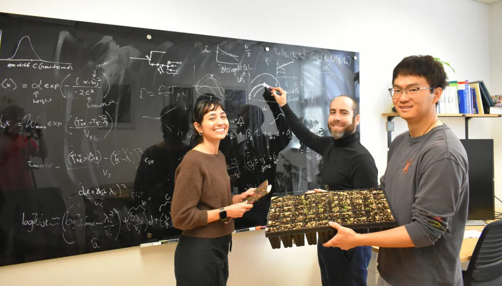 Moisés Expósito-Alonso with the two lead authors of the new study, Tatiana Bellagio and Xing Wu (holding a tray of Arabidopsis seedlings). Image: Moisés Expósito-Alonso/UC Berkeley
