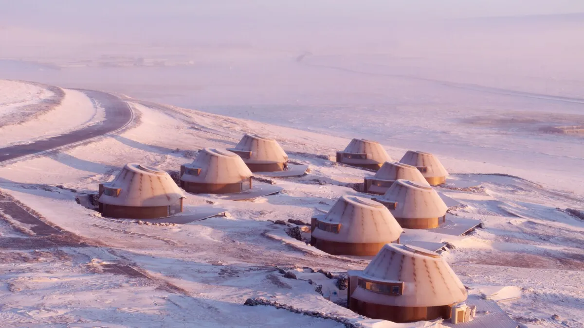 Each guest cabin has a distinctive spherical shape clad in reddish metal panels that mirror the earth tones around it. The roofs are aluminum, reflective against the harsh steppe light. But the real innovation is underneath: the cabins hover slightly above the ground on supports, which means the fragile soil beneath can breathe and recover. No heavy machinery tore up the terrain. No concrete pads crushed the ecosystem. The entire structure was built from prefabricated components assembled on site—a construction method that left the volcanic soil almost untouched.