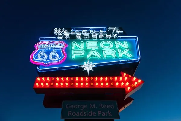 The Neon Park is the first collection of its kind along Route 66, the 2,500-mile artery that connected Chicago to Santa Monica between 1926 and the interstate era. All the signs here originally hung somewhere along that stretch, mostly between the 1950s and 1980s. They arrived through a partnership with the Route 66 Association of Missouri and private donors—people who understood that letting these signs disappear would mean losing pieces of a shared story.