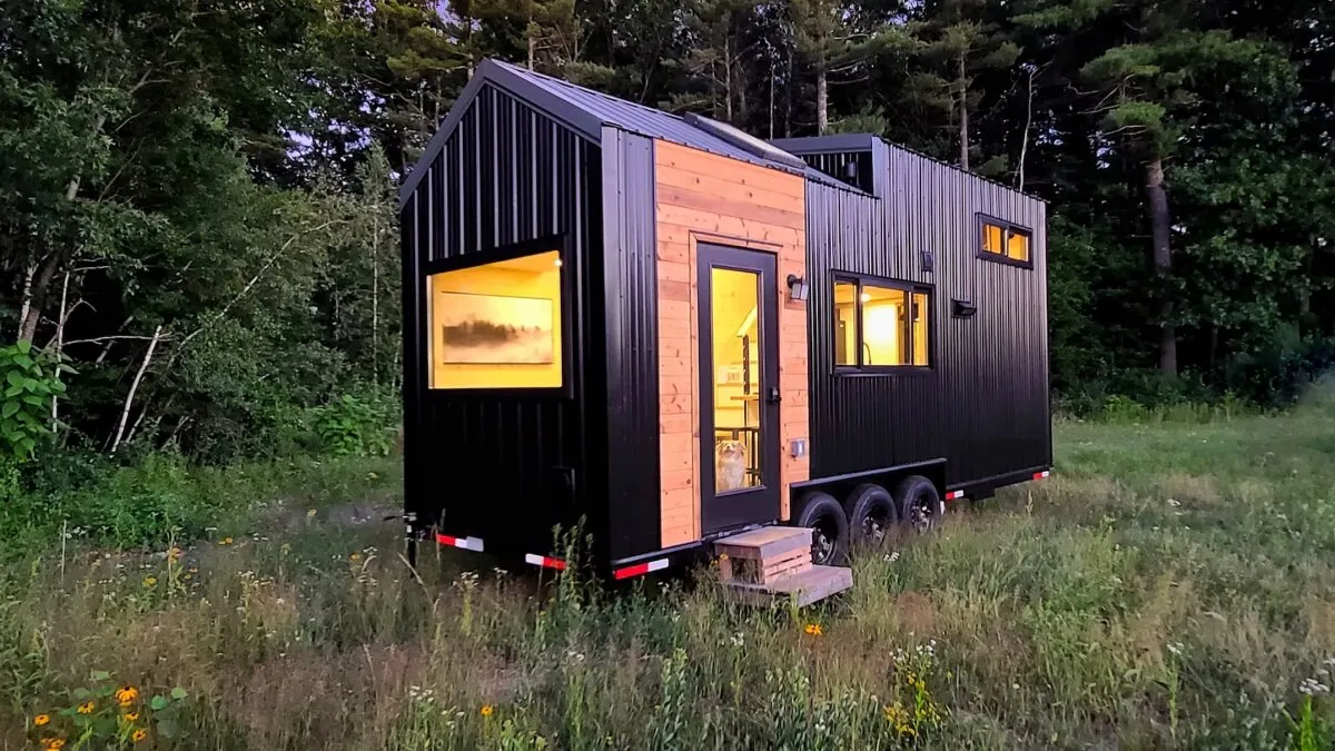 Backcountry Tiny Homes designed the Scandi Inn. It sits on a triple-axle trailer and is 24 feet (7.3 meters) long. This size is smaller for North American tiny houses, more like European models. The exterior combines metal and cedar siding.