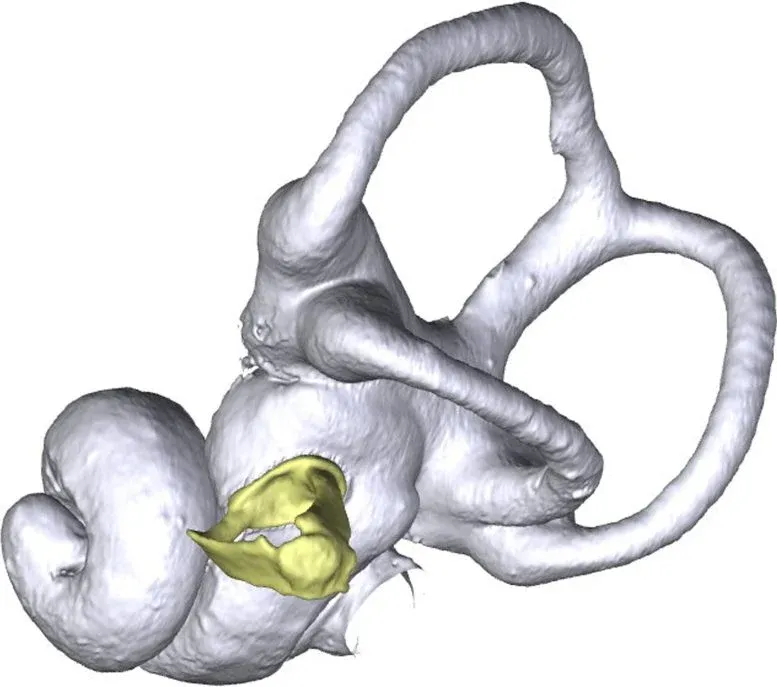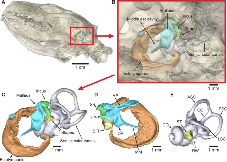 The model showed tiny, dense middle ear bones. It also showed a partly fused connection between the eardrum and the first bone. This structure makes the ear stiffer. It improves the transmission of very high-pitched sounds. This is also seen in animals like bats that use echolocation.