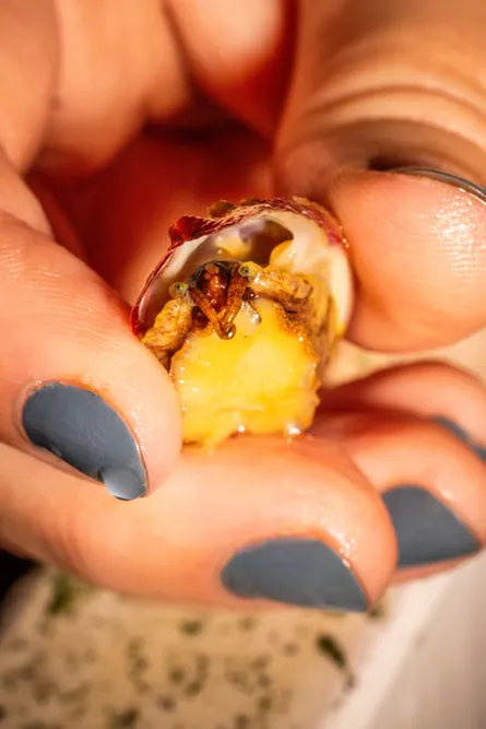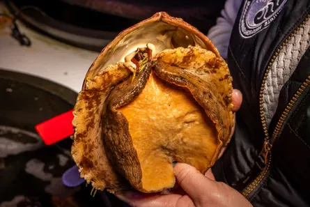 When Frederick holds up a white abalone for inspection, the creature is unremarkable at first—a mauve shell covered in ridges, looking more like a catcher's mitt than a sea snail. Then it moves. The muscular foot lowers, revealing the shell's pearly interior. Two tentacles emerge. A brown head appears. The snail is looking back, curious and shy. Frederick calls them "derpy," and the word fits. There's something endearing about a creature so alien that it becomes charming.
