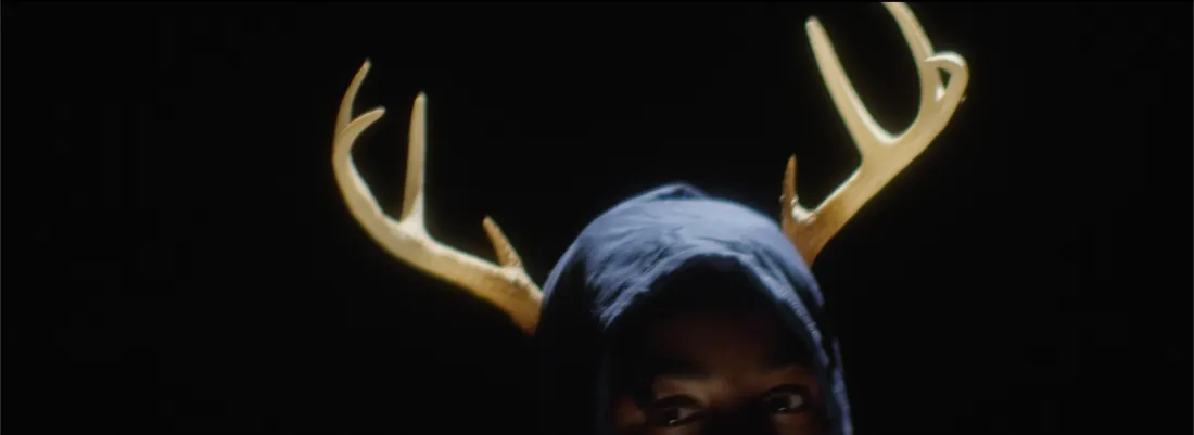Caption: Actor Myles Lassiter, as "kid James," wears antlers in Songs from the Hole. Jacobs says it's the image he's asked about most often. "These antlers, along with being [for the song] 'Most Hunted,' are very gun-hunting, violent-culture — the experience, as a Black man, was that [Black men] were being hunted like deer, like buck in this country. And early references of Black men in this country — we were called Bucks. And so I thought — we [Jacobs and Gayles] thought — it was fitting ... that this character represented the coming-of-age through antlers and the symbolism of being hunted with antlers on his head." Courtesy of Netflix