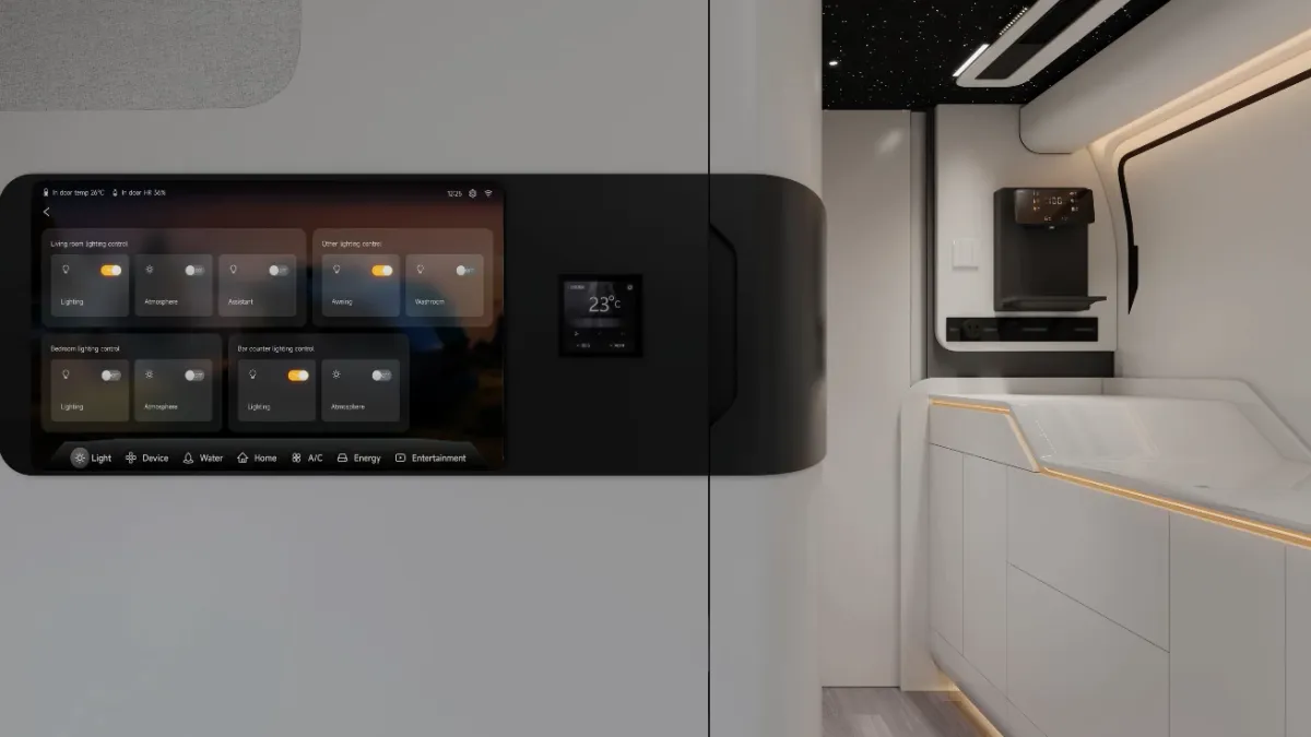 A smart home control system connects the entire cabin. It uses built-in touchscreens, a portable tablet, and a mobile app. The system also supports full-vehicle voice control. One unique feature is an instant movie theater mode for both the living room and bedroom. With one button, a 60-inch projector screen lowers, lights dim, blackout shades close, and the bed or sofa reclines.