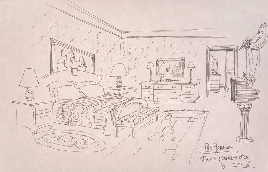 Key locations in "The Sopranos" include Melfi’s office, Tony’s home, the Bada Bing strip club, and Satriale’s Pork Store. The exhibition displays detailed drawings of these places. For example, visitors can see the back room of Satriale’s, where Tony's crew often met.