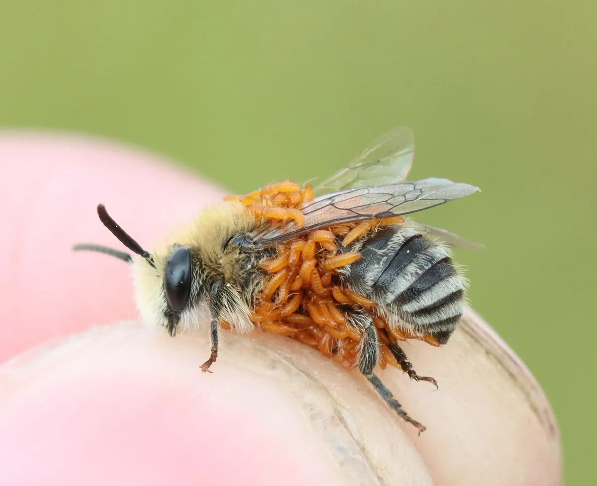 Researchers studying the European black oil beetle (Meloe proscarabaeus) discovered that the larvae cluster together on grasses in early spring, turning themselves orange and releasing 17 floral compounds—including linalool oxide and lilac aldehyde—that naturally attract pollinators. When a bee arrives expecting nectar, the larvae cling to its body and travel back to the nest, where the real plundering begins.