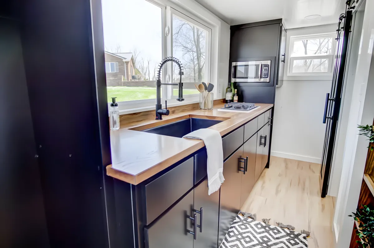 Start Your News DetoxNext to the living room is the kitchen. It's simple but functional, with a granite sink, a two-burner propane stove, a small fridge, and a microwave. It also features butcher block countertops and plenty of cabinets. A custom bookcase on rails slides open to reveal a hidden storage area.