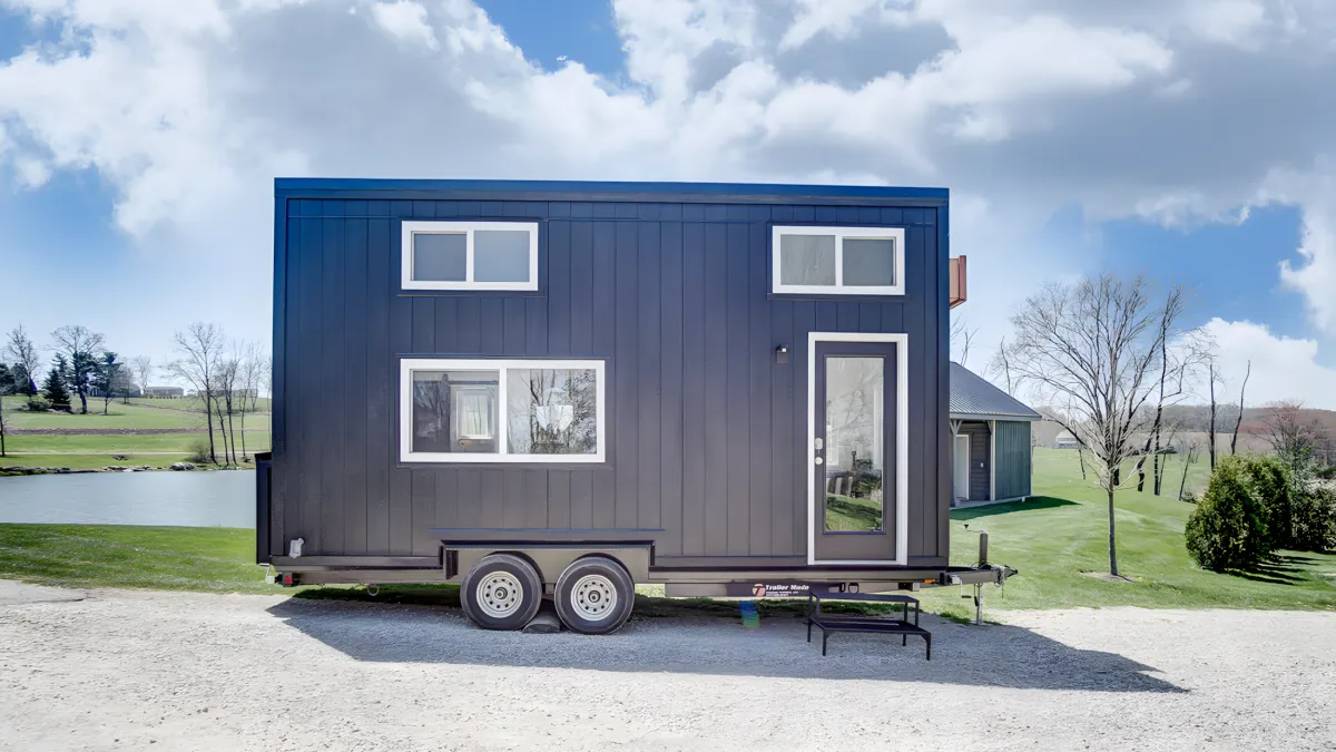 Modern Tiny Living designed the Espresso. It's only 20 feet (6 meters) long, which is quite small for a tiny house in North America. It's built on a double-axle trailer with engineered wood siding and a steel roof. There's also a small box outside for things like propane tanks.