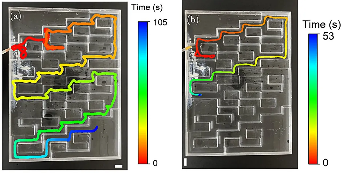 Start Your News DetoxThe team tested this through a combination of computer simulations and real experiments. In the simulations, they placed chemical droplets at the entrance of labyrinth-like mazes filled with dead ends. The droplets consistently chose the correct path at each intersection and reached the exit efficiently, even as the mazes grew larger and more complex. Traditional navigation strategies—following a chemical signal placed at the destination—fell apart at distance, as the guiding signal weakened the farther it traveled.