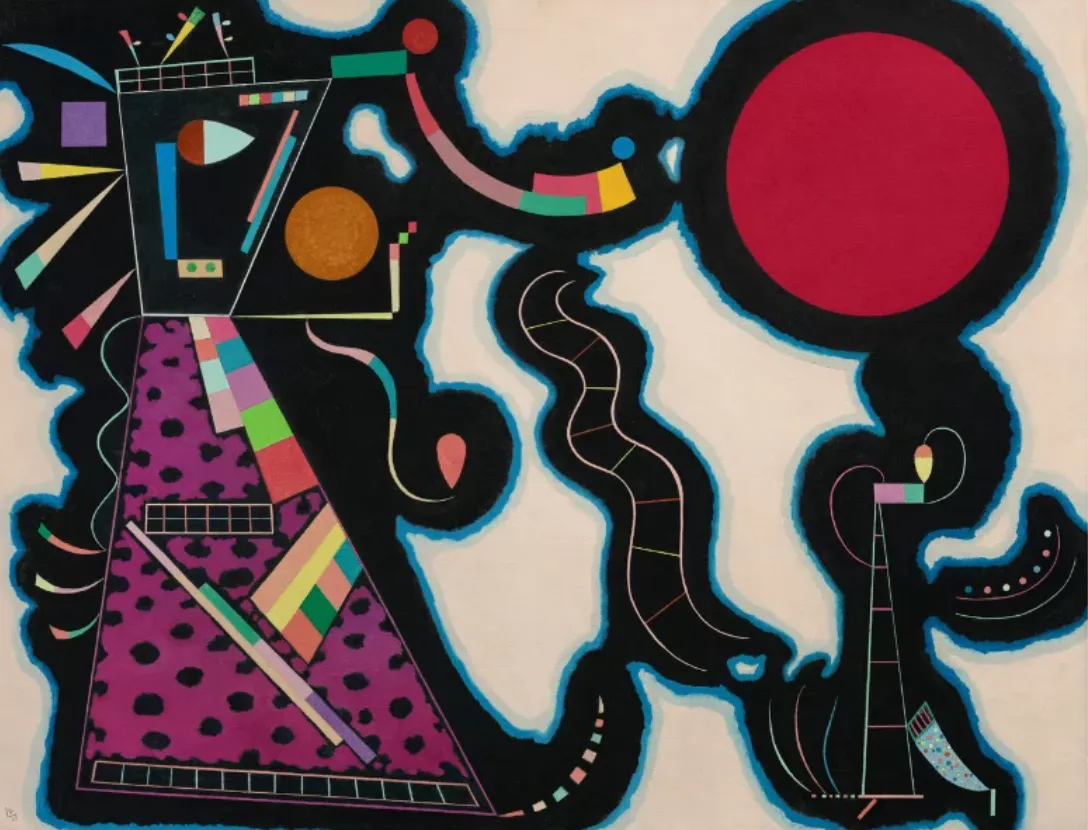 When Wassily Kandinsky painted "Le Rond Rouge" in 1939, he was living in self-imposed exile in Paris with his wife Nina, having fled Nazi Germany six years earlier. The canvas—a bold red circle surrounded by playful biomorphic forms and geometric shapes—represents something quietly defiant: an artist in his seventies, displaced from his homeland, still pushing abstraction into new territory.