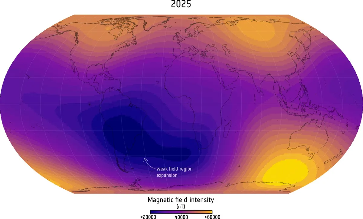 Earth's magnetic shield is reshaping itself, and it's happening unevenly across the planet. Eleven years of satellite data now show that a weak zone in the magnetic field over the South Atlantic—already known to exist—has expanded to nearly half the size of continental Europe since 2014.